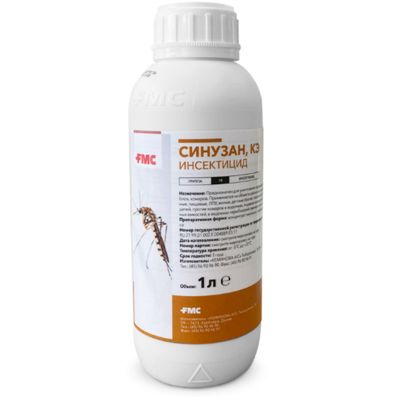 «Синузан» 48% к.э., обладает широким спектром инсектицидного действия, в отношении рыжих и черных тараканов, мух, блох, постельных клопов, комаров. Длительность остаточного действия до 1 месяца.